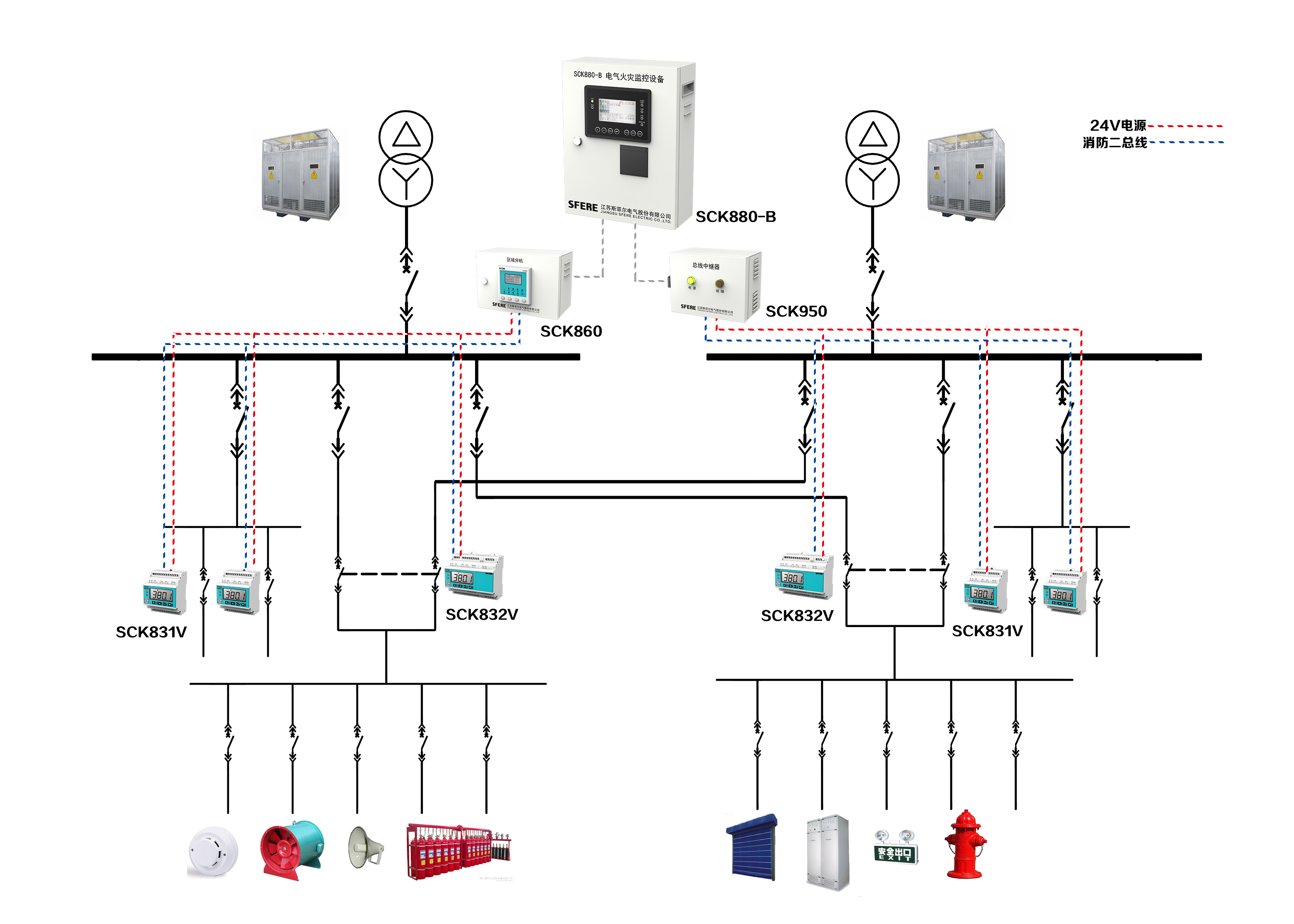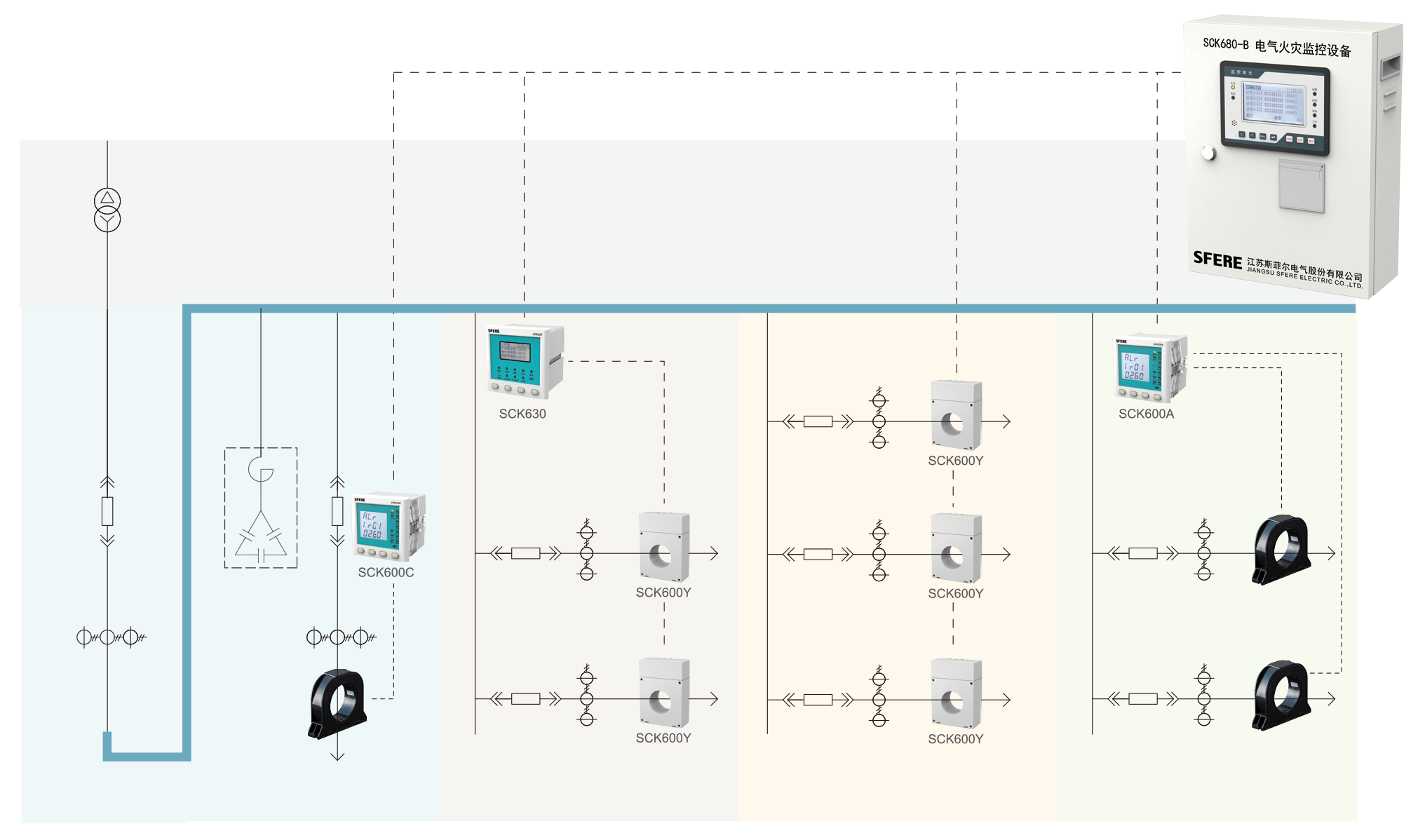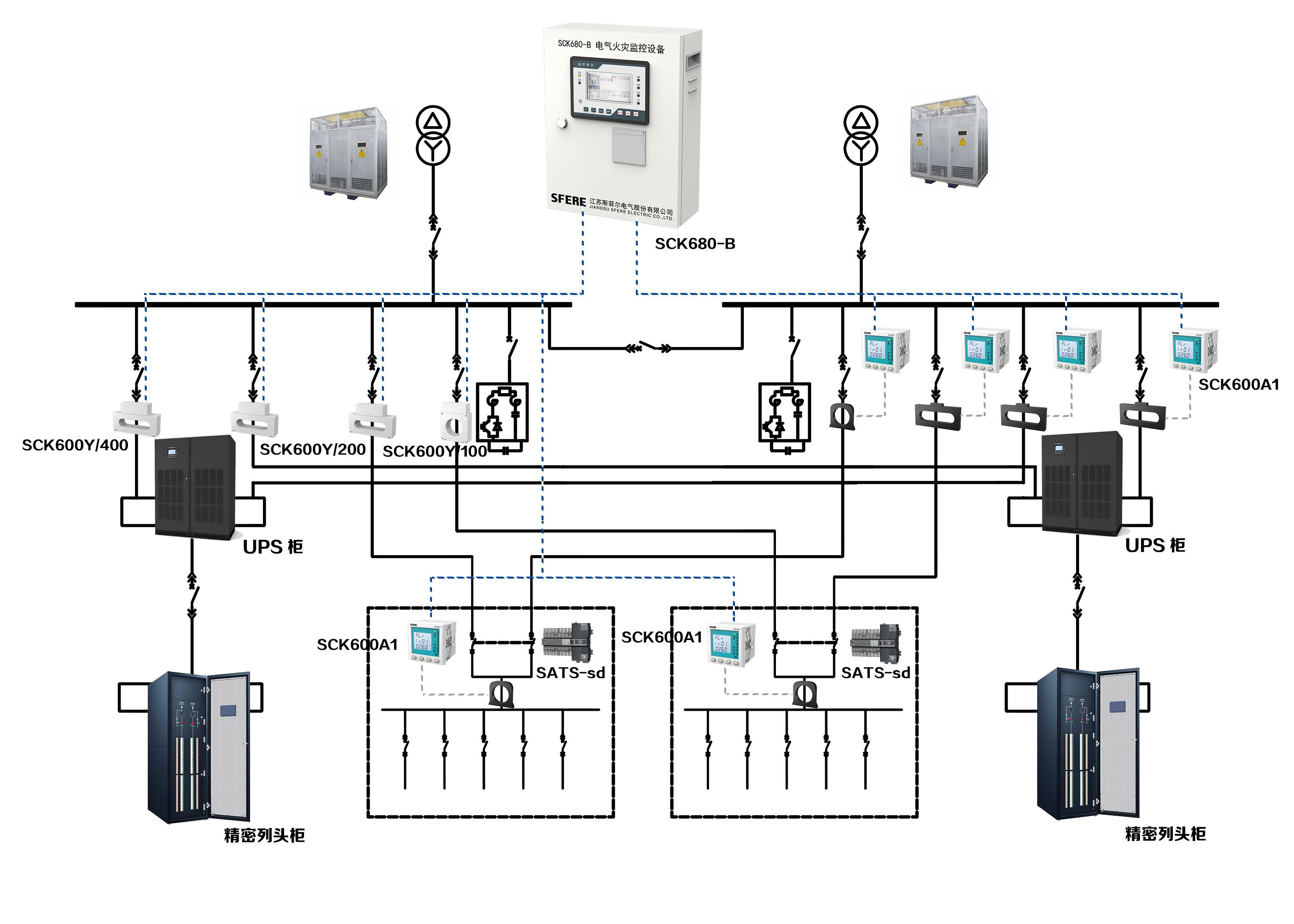 場(chǎng)景及功能描述在數(shù)據(jù)中心內(nèi),SCK600電氣火災(zāi)監(jiān)控系統(tǒng)可安裝于TN-S、TN-C-S以及局部TT低壓配電系統(tǒng)中,系統(tǒng)包含SCK680電氣火災(zāi)監(jiān)控設(shè)備、SCK600電氣火災(zāi)監(jiān)控探測(cè)器以及剩余電流互感器、溫度傳感器等附件。電氣火災(zāi)探測(cè)器用于監(jiān)測(cè)回路中剩余電流、負(fù)荷電流、電纜溫度等參數(shù),同時(shí)上傳至監(jiān)控設(shè)備實(shí)現(xiàn)集中控制和集中管理;當(dāng)回路中相關(guān)參數(shù)異常時(shí),監(jiān)控設(shè)備發(fā)生聲光報(bào)警,指示報(bào)警部位,同時(shí)現(xiàn)場(chǎng)探測(cè)器發(fā)出聲光報(bào)警和控制信號(hào),提醒用戶對(duì)隱患線路進(jìn)行排查或者更換,降低由于電氣原因造成火災(zāi)的風(fēng)險(xiǎn)。