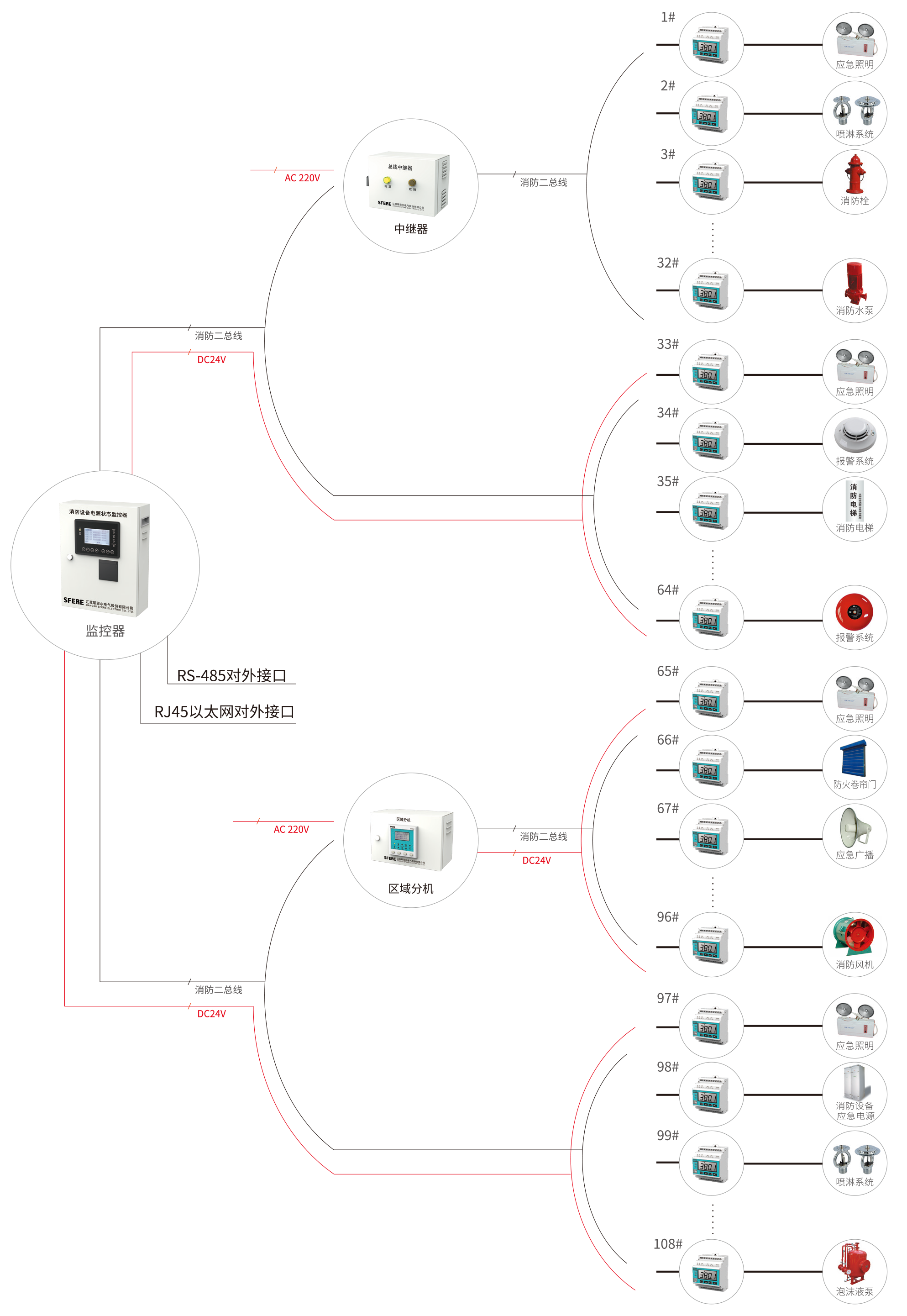? 1路RS485通信接口,標(biāo)準(zhǔn)MODBUS-RTU協(xié)議,1路消防二總線通信接口;