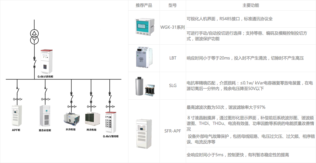 對于數據中心基礎設施設備,主要非線性負荷為空調機組和照明及辦公設備等,采用動態消諧式無功補償提升系統功率因數,同時采用有源電力濾波器解決諧波問題,消除諧波對電力系統的危害,避免諧振風險,有效改善用電環境,提升系統可靠性。